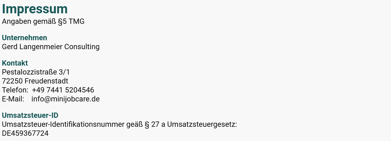 © Copyright Gerd Langenmeier Consulting. Die Inhalte sind urheberrechtlich geschützt. Alle Rechte vorbehalten. Insbesondere dürfen Nachdrucke, öffentliches Zugänglichmachen, insbesondere durch Aufnahme in fremde Internetangebote und Online-Dienste, Links auf die Seite der minijobcare.de sowie Vervielfältigungen auf Datenträger aller Art, z.B. CD-ROM, DVD-ROM usw., auch auszugsweise, nur nach vorheriger schriftlicher Zustimmung durch die Gerd Langenmeier Consulting erfolgen. Für Inhalte von Webseiten, auf die durch einen Link verwiesen wird und Inhalte, die ausdrücklich oder konkludent, z.B. mittels Urhebervermerk oder entsprechendes Branding als fremde Inhalte gekennzeichnet sind, übernimmt die Gerd Langenmeier Consulting keine Haftung.